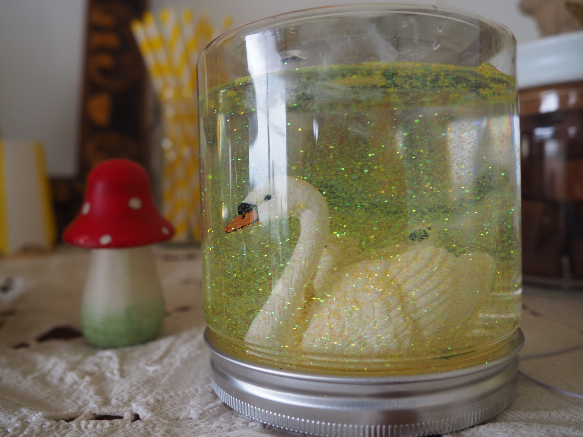 Dans le couvercle de votre pot, collez vos figurines avec de la colle extra forte. Si votre pot est un peu étroit, prenez soin de coller vos figurines au centre du couvercle de manière à pouvoir fermer le couvercle sans problème. Laissez sécher toute une nuit. Le lendemain, remplissez votre pot d’eau déminéralisée, ajoutez-y une cuillère de glycérine et une grosse pincée de paillettes. Fermez votre pot. Vissez fort le couvercle. Je vous conseille de mettre de la colle au niveau du couvercle pour éviter que l’eau ne s’échappe avec le temps.