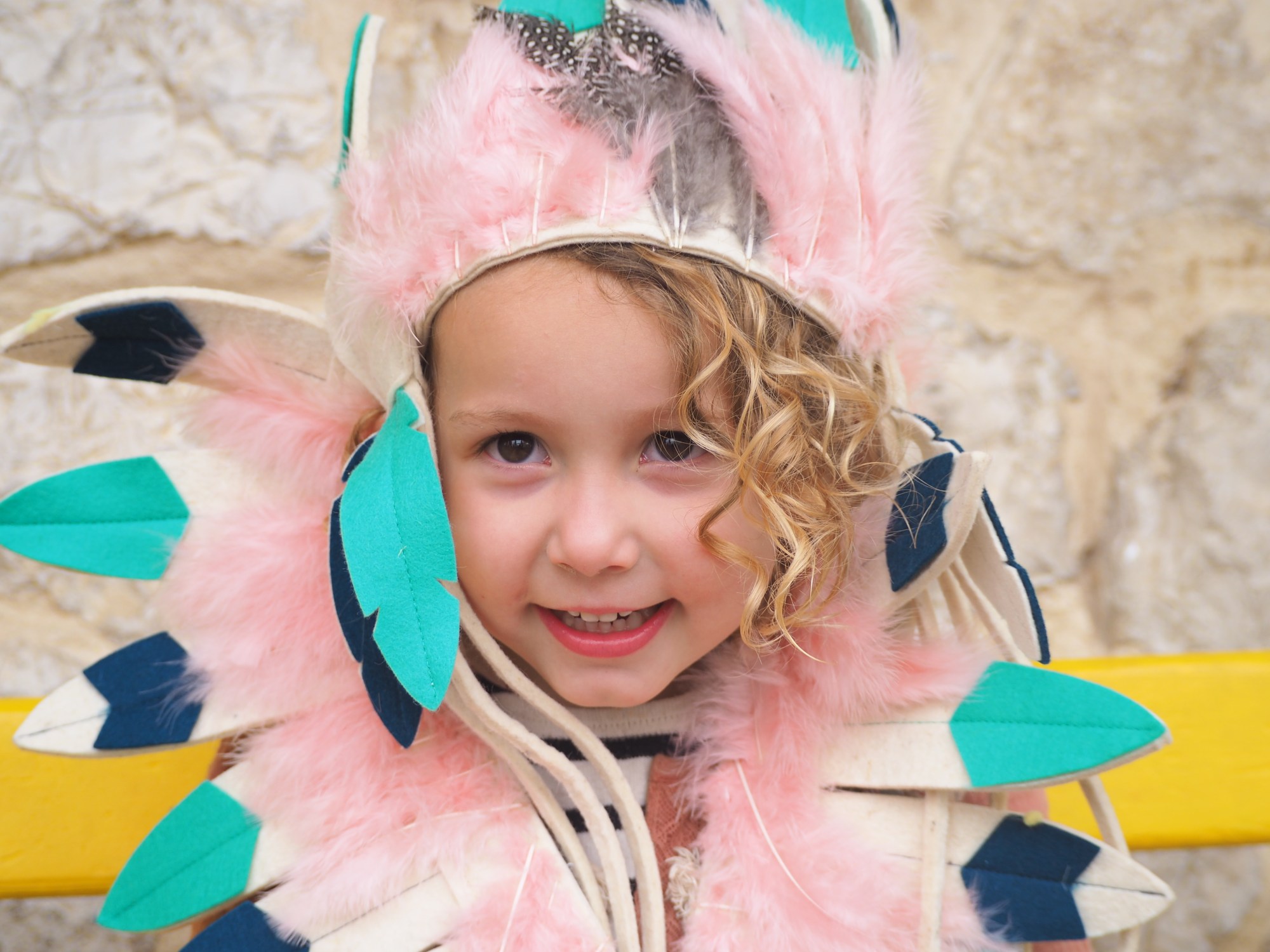 Et puis une semaine avant la date du carnaval de l’école, Violette m’a glissé au détour d’une conversation qu’elle voulait être déguisée en Reine…… J’ai mis longtemps à comprendre….on ne regarde pas la télé à la maison… Mais j’ai bien dû me rendre à l’évidence qu’on parlait bien ici de la Reine des Neiges! On en a convenu en discutant un peu que ça serait la Reine des Indiennes, et c’est d’ailleurs ce que Violette disait aux personnes qui lui demandait en quoi elle allait être déguisée! Violette était très fière de son déguisement même si je vous avoue qu’elle a rapidement enlevé la couronne, car ce n’était pas très pratique pour jouer avec les copines!