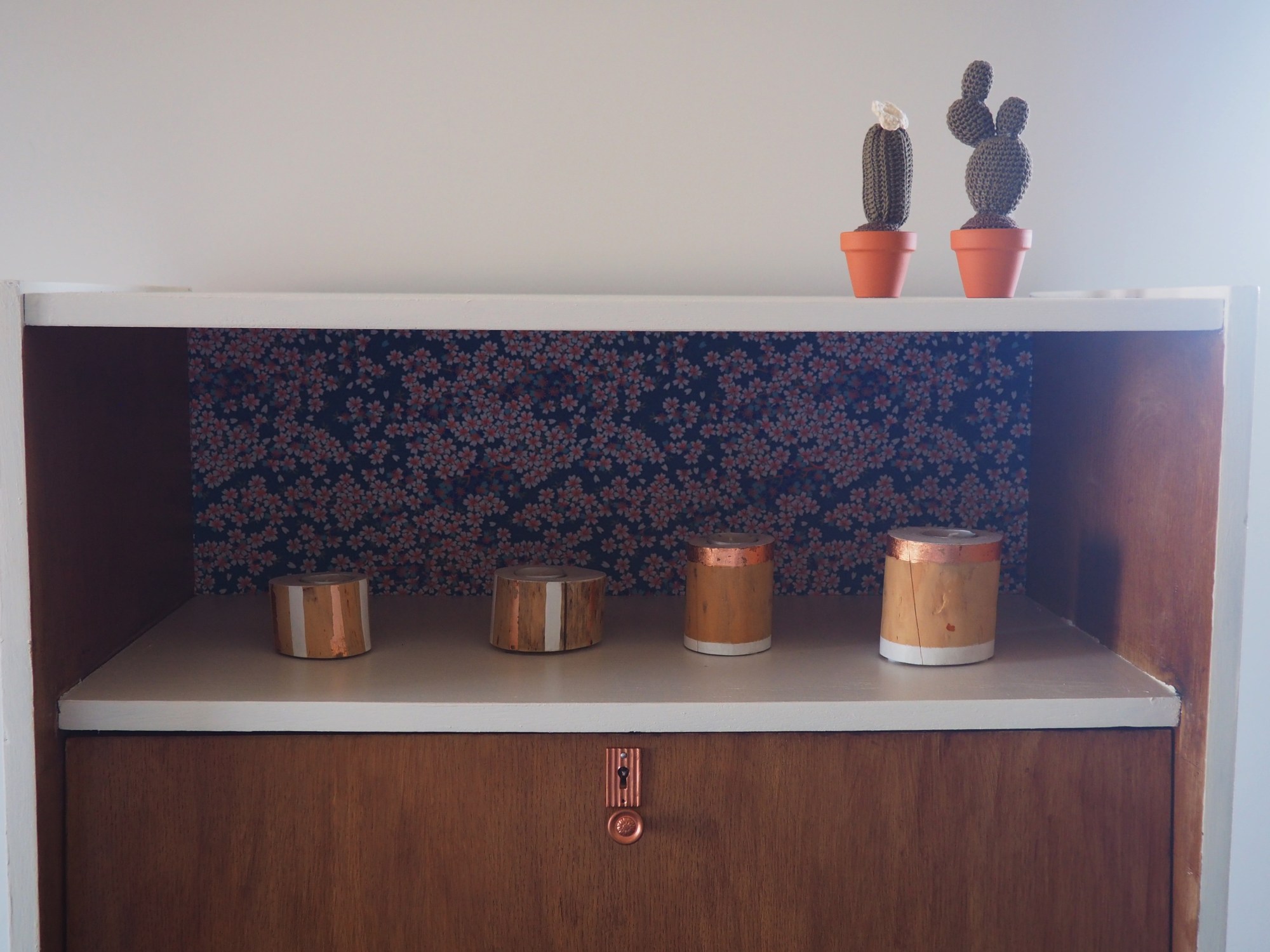 J’ai d’abord démonté toutes les différentes parties du meuble et je les ai poncées, j’ai dû utiliser un produit décapant pour enlever la peinture noire qui ne partait pas au ponçage. Une fois poncé et nettoyé, j’ai passé une sous-couche et deux couches de peinture blanche et j’ai vernis la porte et les pieds pour garder la couleur naturelle du bois. Pour les poignées des tiroirs, elles étaient abimées mais j’aimais beaucoup leurs formes vintage, je les ai passé à la bombe de peinture couleur cuivre ce qui a caché les petits défauts et leur a donné une deuxième jeunesse! Une fois le tout terminé, j’ai collé sur le fond supérieur du meuble une feuille de papier japonais à la mesure exacte. Le papier japonais est un papier très fin et parfait pour décorer des meubles, je l’ai trouvé sur le site Adeline Klam qui en vend toute une jolie série.