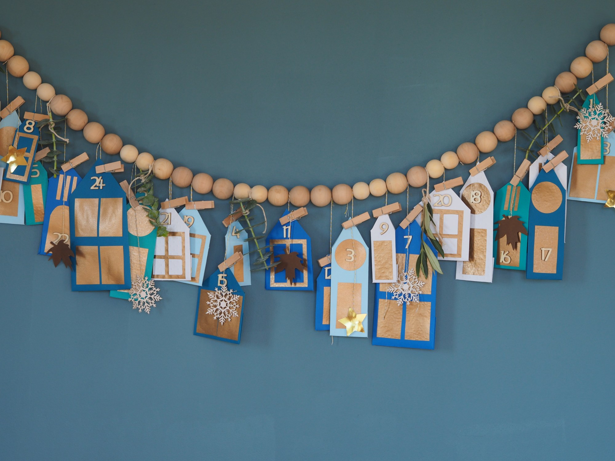 Pour la première version du calendrier, passez des perles en bois sur une corde, j’ai intercalé 4 grosses perles avec 2 moyennes. Faites un noeud de chaque côté puis attachez entre les perles des morceaux de ficelles pour pouvoir suspendre vos vingt-quatre maisons. J’ai parfois doublé mon fil pour faire pendre deux maisons au même endroit. Ensuite, collez vos décorations en papier (feuilles, étoiles, nuages, flocons en papiers) sur le bout de certaines ficelles. Je vous conseille de ne pas en coller sur chaque ficelle pour ne pas surcharger le calendrier! Puis suspendez vos maisons en les attachant à chaque ficelle à l’aide d’une petite pince à linge. Rajoutez des petites branches d’eucalyptus et d’oliviers pour donner une touche végétale au calendrier.