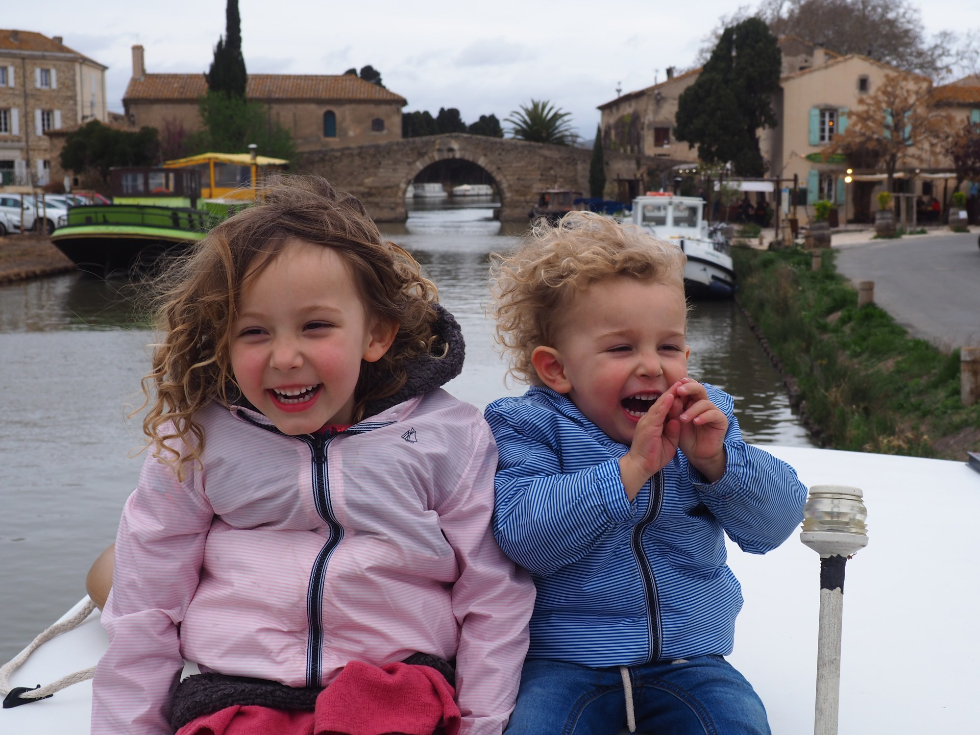 Les jours suivants on été beaucoup plus calmes et ensoleillés, et les enfants ont adoré naviguer en bateau et dormir sur l’eau! On s’est promené sur le canal de Midi, on a fait des escales à terre pour visiter quelques villages et se ravitailler un peu. On a visité à Somail une ancienne librairie, d’une taille incroyable, dans laquelle on a acheté un tas de livres d’occasion pour Violette et Léon. De quoi les occuper un peu pendant les heures de navigation! Puis, on a organisé une chasse aux oeufs au milieu de la campagne sur les bords du canal. On avait loué deux vélos avec le bateau, ce qui nous a permis de nous balader facilement avec les enfants. On s’est dit qu’on avait de la chance d’être là et on a savouré ce bonheur d’être ensemble dans cet endroit merveilleux.