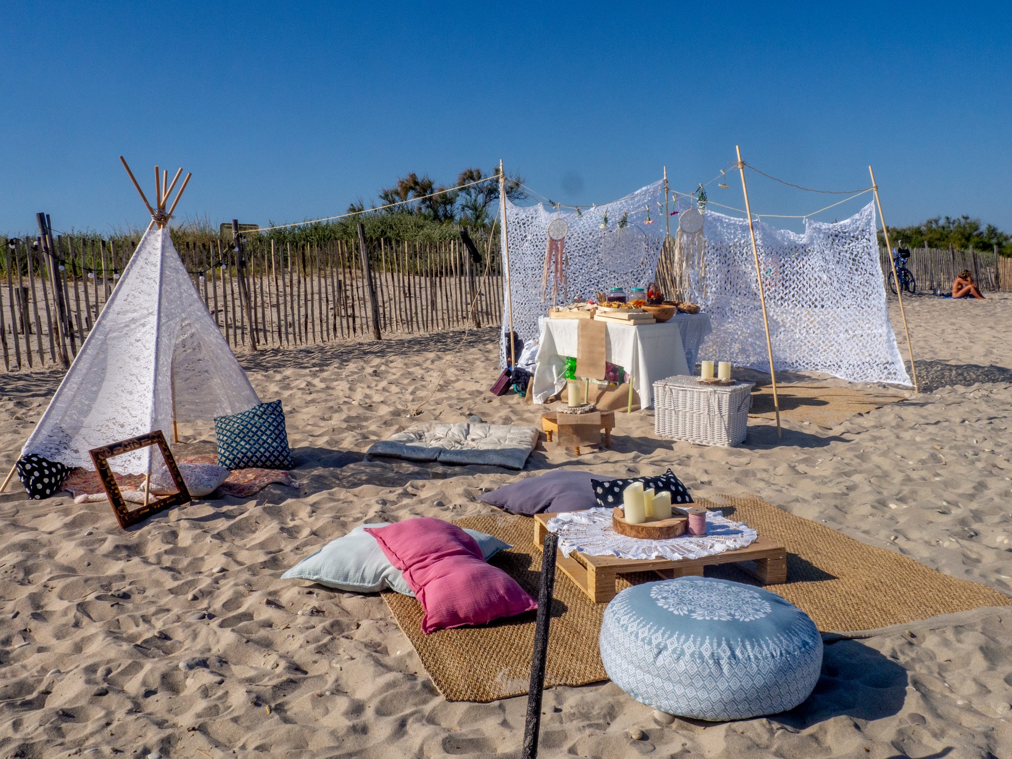 Il a fallu tout apporter et nous avons ramené quelques kilos de sable au retour dans nos affaires, mais en organisant les choses à deux, tout est plus simple et rapide! Nous sommes parties sur une déco bohème, qui s’adapte parfaitement à l’endroit. Nous avons monté un petit stand en accrochant des filets de camouflage blanc sur des tasseaux. Nous avons fait pendre quelques attrape-rêves et des fleurs sur de la ficelle! Nous avons orné la table de saladiers en bois, et de cornets de glace remplis de fleurs. J’avais testé les fleurs en vase l’année dernière mais avec la brise marine, les vases se renversent sans cesse… Nous avons apporté une palette pour faire un petit coin chill-out. Violette m’a prêté son tipi pour la soirée, nous avons disposé un bout de jonc de mer au sol, quelques coussins, des petites bougies électriques, et le tour était joué! Tout le monde est venu de blanc vêtu, nous étions sur une plage un peu éloignée et on en a profité pour se relaxer, pour se baigner dans l’eau bien chaude et sentir les rayons de fin de journée sur notre peau tout en bavardant, un verre à la main.