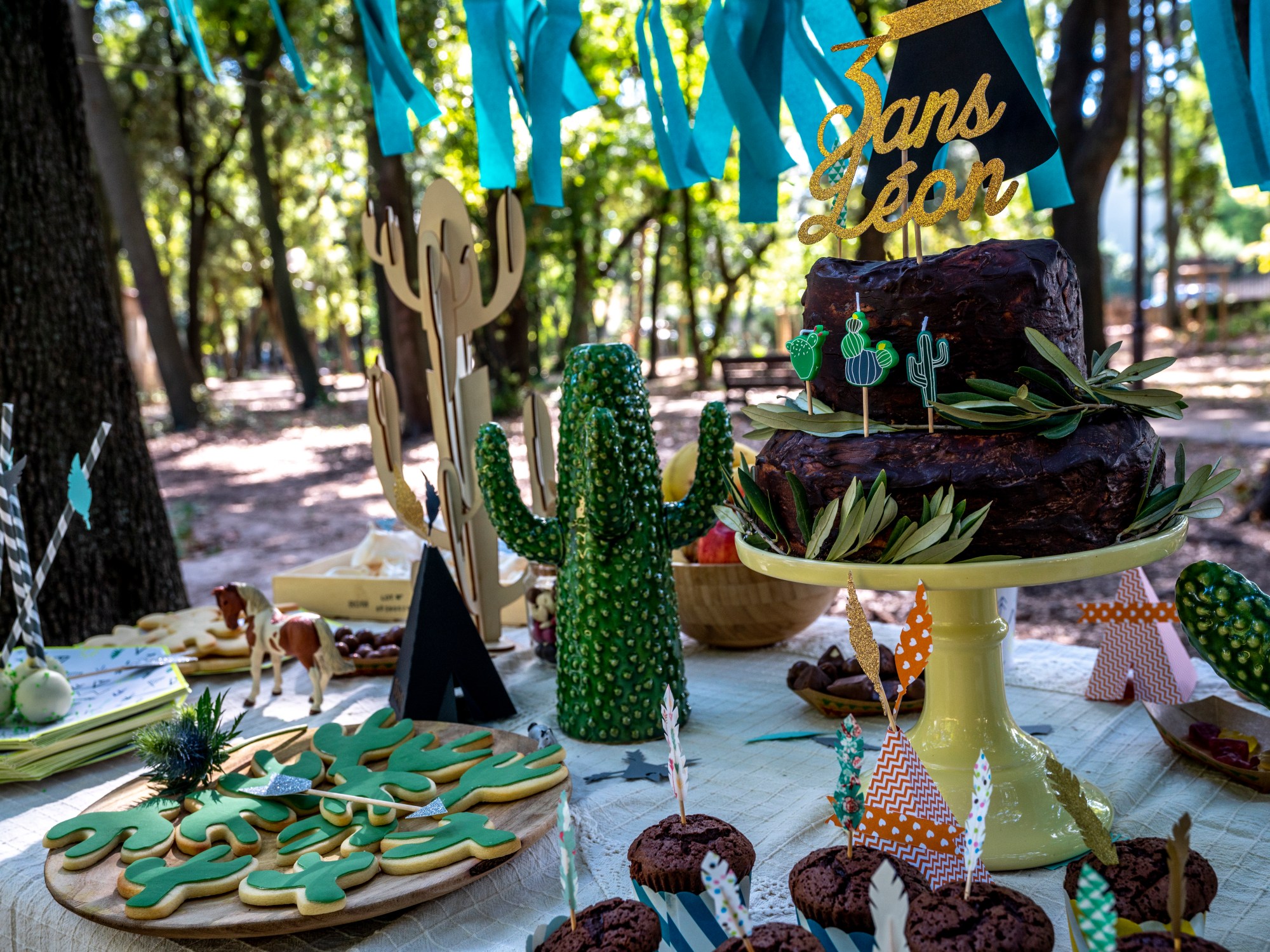 J’ai déniché sur etsy des petits tipis, des flèches et plumes en papier qui étaient idéals pour la décoration. J’ai rajouté quelques chevaux, des cactus, et quelques guirlandes pour égayer la table. J’ai suspendu de la bruyère et des chardons à une ficelle car j’aime apporter un côté végétal aux fêtes!