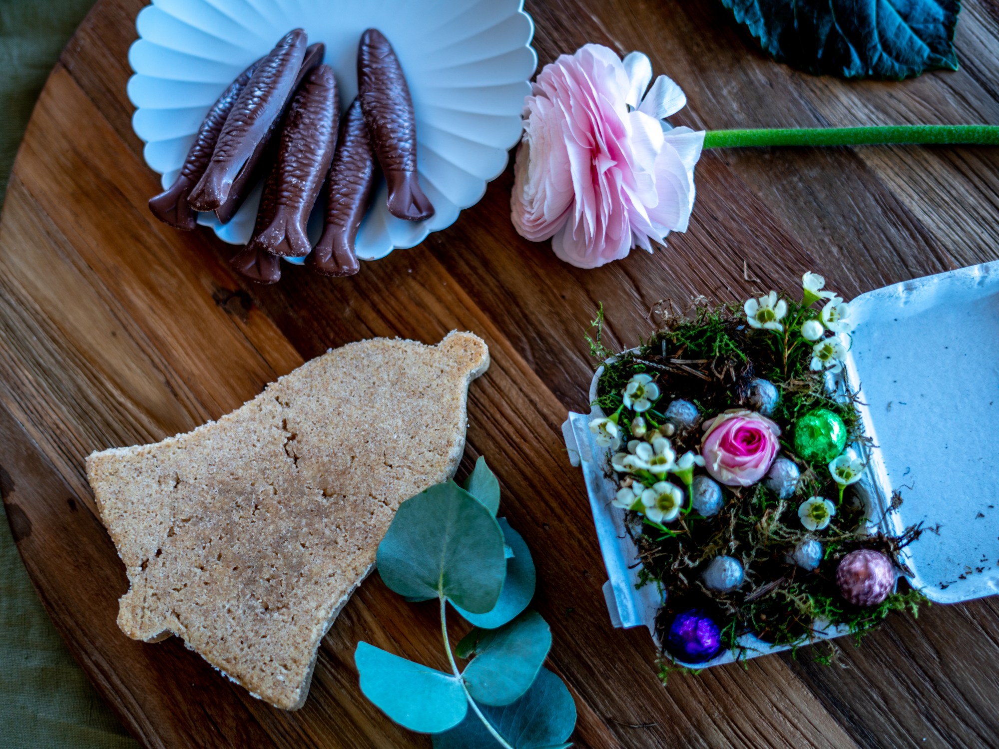 Comme nous n’avons pas de jardin, j’ai essayé de recréer une atmosphère green sur la table! Les rondins ont servi pour déposer de la mousse des bois et des lapins ( que j’ai chipé à Léon pour l’occasion) ont habillé notre petit jardin d’intérieur! J’ai posé également quelques fleurs pour apporter de la couleur, les gâteaux se sont transformés en lapins ou cloches, et un joli nid avec des oeufs a pris place au centre de la table!