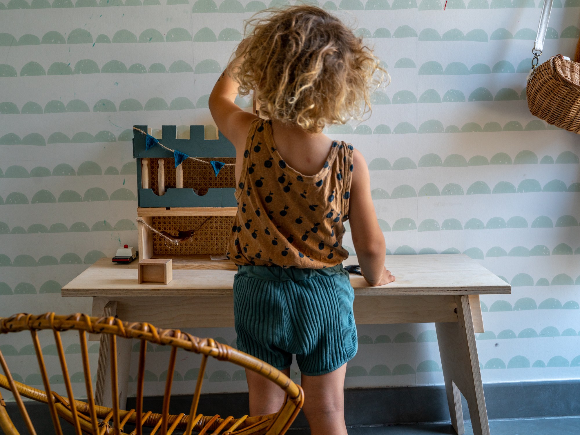 J’ai également collé au pistolet à colle du cannage sur le fond des boîtes. La rambarde en bois est réalisée avec des pinces à linge en bois aux embouts ronds (je crois qu’on en trouve en magasin bio). Pour finir, j’ai peint les remparts de couleur verte et j’ai réalisé un hamac avec du tissu, deux morceaux de bois et de la ficelle. J’ai agrémenté d’une guirlande à fanions, de petits drapeaux et d’une échelle en corde! Léon était complètement conquis par ce jouet mais il m’a quand même fait remarquer qu’il manquait une échelle pour monter sur le toit! Je corrige ça très vite!